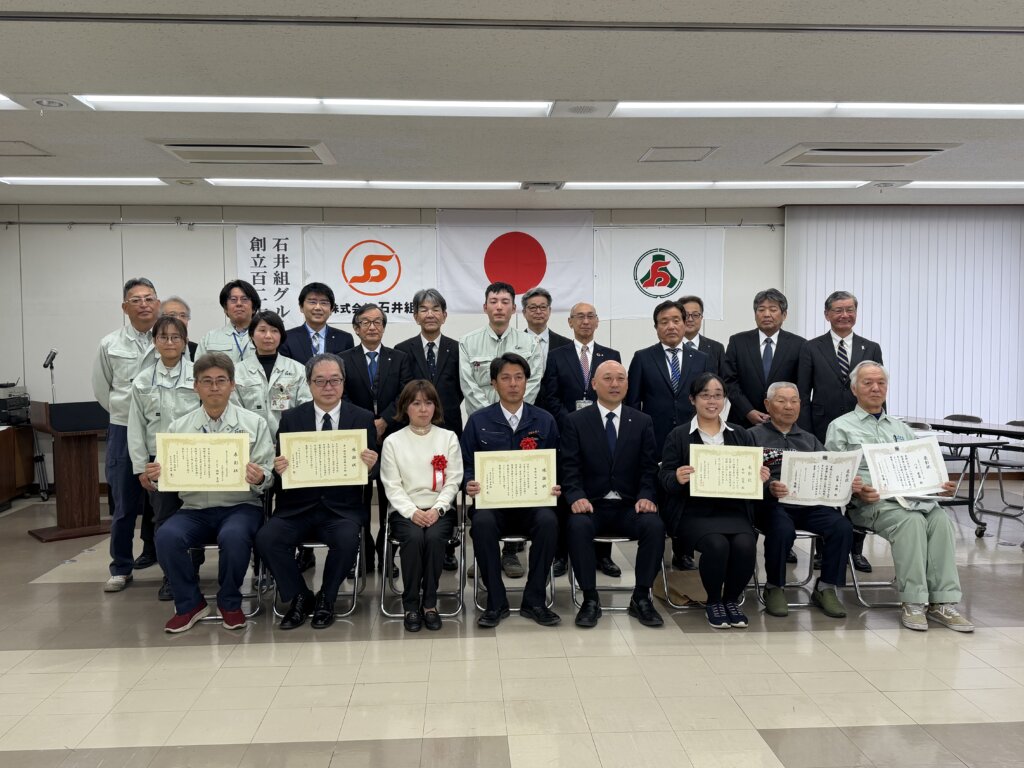 当日は、石井組社員をはじめ、富士運送株式会社、NBS株式会社の社員が出席し、優良現場表彰、資格取得表彰、優良事業所表彰などを行いました。